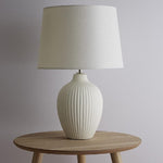 Finish: Cream Ceramic Ribbed Pattern with Matching Cotton Drum Lampshade