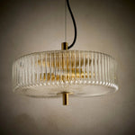 Add refined elegance and a touch of charm to your space with this modern gold 2 lamp pendant light. Designed with modern sophistication in mind, this stunning fixture features a hand-blown ribbed glass shade in a wide, drum-like silhouette that softly diffuses light for a warm, ambient glow. The pendant is accented by sleek brushed brass hardware, offering a rich contrast to the textured glass and enhancing its luxurious presence. Suspended by a discreet cable and black cord, it floats effortlessly above dining tables, kitchen islands, or entryways, making it a perfect statement piece for contemporary, retro, or Art Deco-inspired interiors.