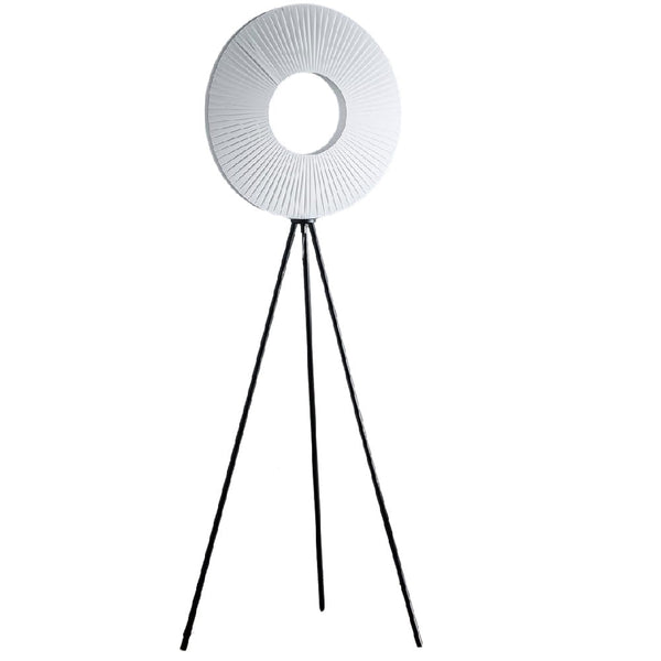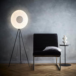 Britalia BRLRILEY/FL LED Black and White Modern Tripod Floor Lamp with Sculptural Ring Shade - 150cm Height  Elevate your interior with the striking a bold blend of sculptural form and...