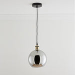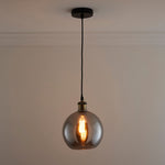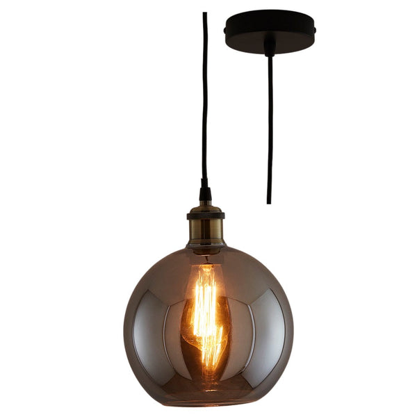 A stunning matt black & antique brass metalwork pendant ceiling light with smoke glass open globe dome shade. The matt black round fixing plate extends to a black cable that supports the high quality smoke glass lampshade. The antique brass lampholder and metal black shade cap adds an industrial vibe. Can used as a single indoor pendant light or grouped above a dining table or kitchen breakfast bar.