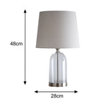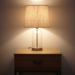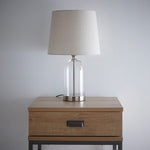 A stunning vintage style table lamp with a clear glass bell cloche jar dome base and satin nickel metal accents. A mix of modern day & vintage retro designs creating an eye catching table light whether unlit or illuminated. The satin nickel silver base cap, rod that goes through the middle of the glass & top cap add an industrial vibe to the overall look. Complete with a high quality natural linen tapered drum shade. Ideal as a single table desk lamp or paired to balance the room.